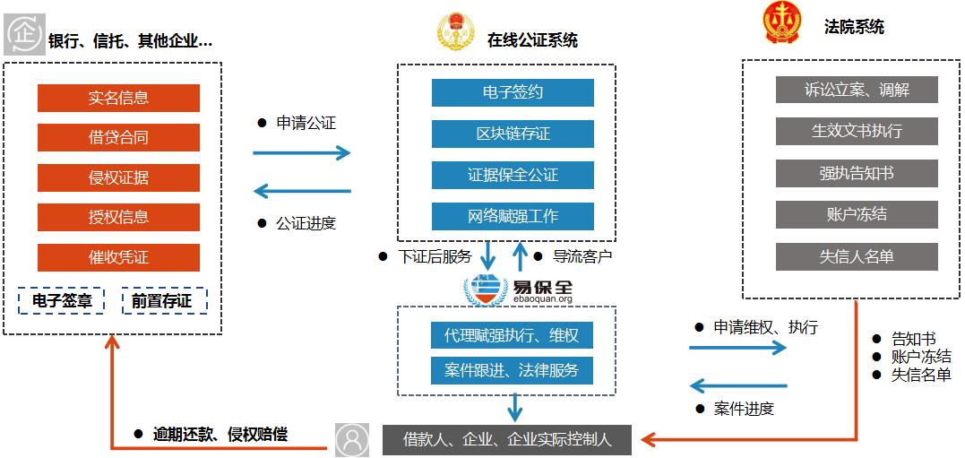 通过把证据保全需求方或银行等金融机构系统,与公证系统进行接口对接,实现事前区块链存证,事后在线申请公证的方式,批量化、高效率办理公证,通过打通上下游及辅助服务,为用户提供一站式解决方案;