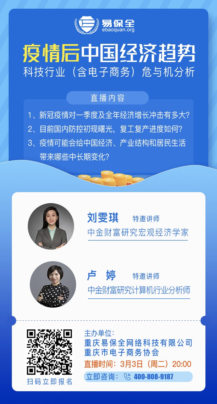 为助力各大企业渡过难关,转"危"为"机"。易保全联合重庆市电子商务协会特别邀请到中国国际金融股份有限公司(中金)两位资深专家,进行“疫情后中国经济趋势科技行业(含电子商务)危与机分析”线上公益直播课分享,为我们带来线上直播解读,现场答疑指导。
